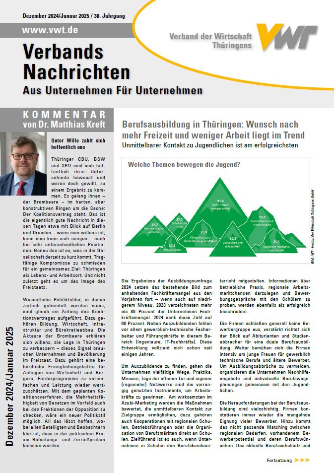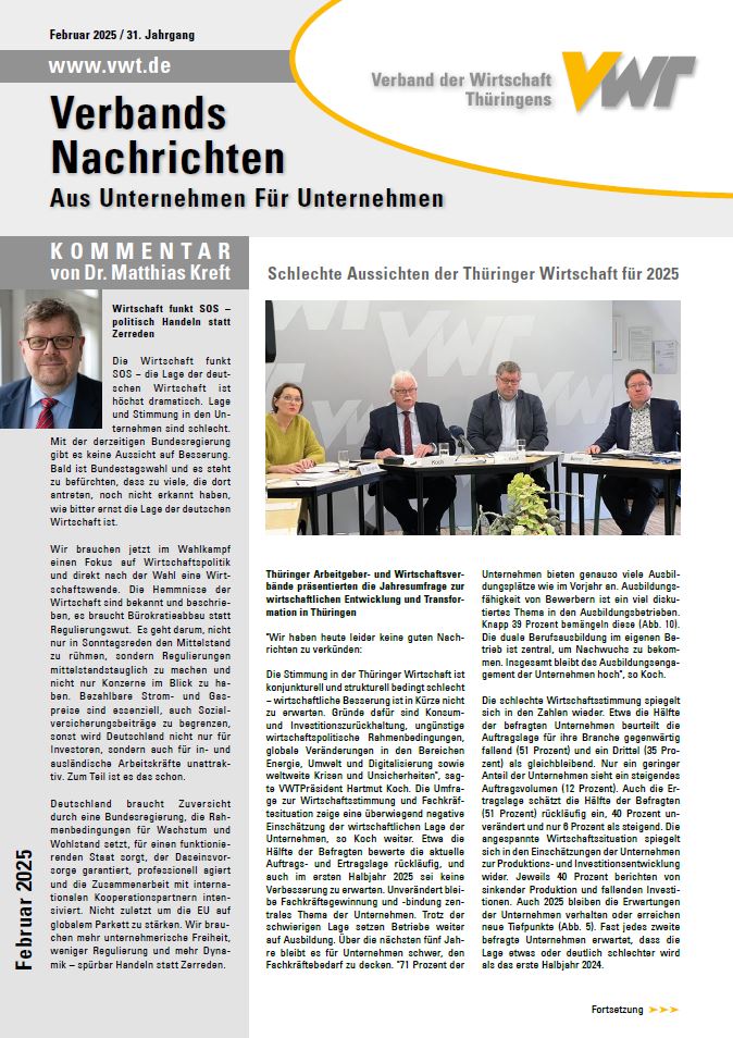 Die Jahresumfrage der Arbeitgeber- und Wirtschaftsverbände Thüringens ist eine Mitgliederbefragung des VWT, die seit 2005 jährlich durchgeführt wird. Sie wird fachlich und inhaltlich vom IWT - Institut der Wirtschaft Thüringens betreut. Jede Jahresumfrage behandelt drei Schwerpunkte: